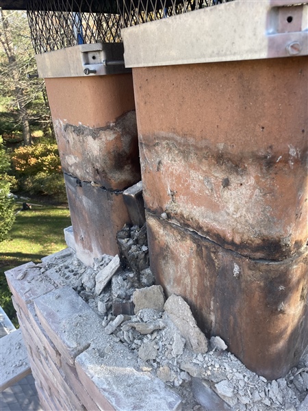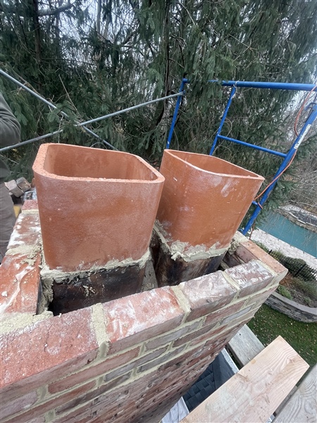To complete the repair, new chimney caps were installed to protect against rain, debris, and animal intrusion, while the surrounding brickwork was cleaned and restored for a uniform, finished appearance. The result is a structurally sound, weather-resistant chimney top that not only functions properly but also restores the chimney’s overall look. This repair extends the life of the chimney, prevents future water damage, and ensures safe, reliable performance for years to come.