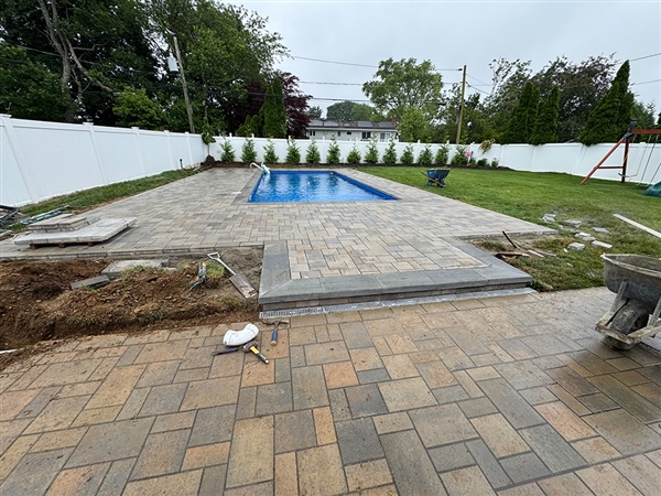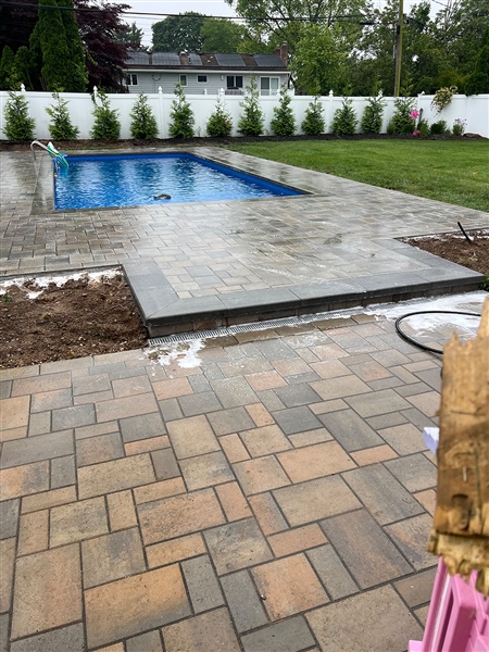 This masonry paver project in Commack focused on creating a clean, functional poolside space while solving a critical drainage challenge common to Long Island properties. The pool area was framed with precision-cut pavers, laid on a properly prepared base to ensure long-term stability and a smooth, finished look that complements the home. Careful attention was paid to grading around the pool, allowing water to naturally move away from the structure without disrupting the visual flow of the patio.